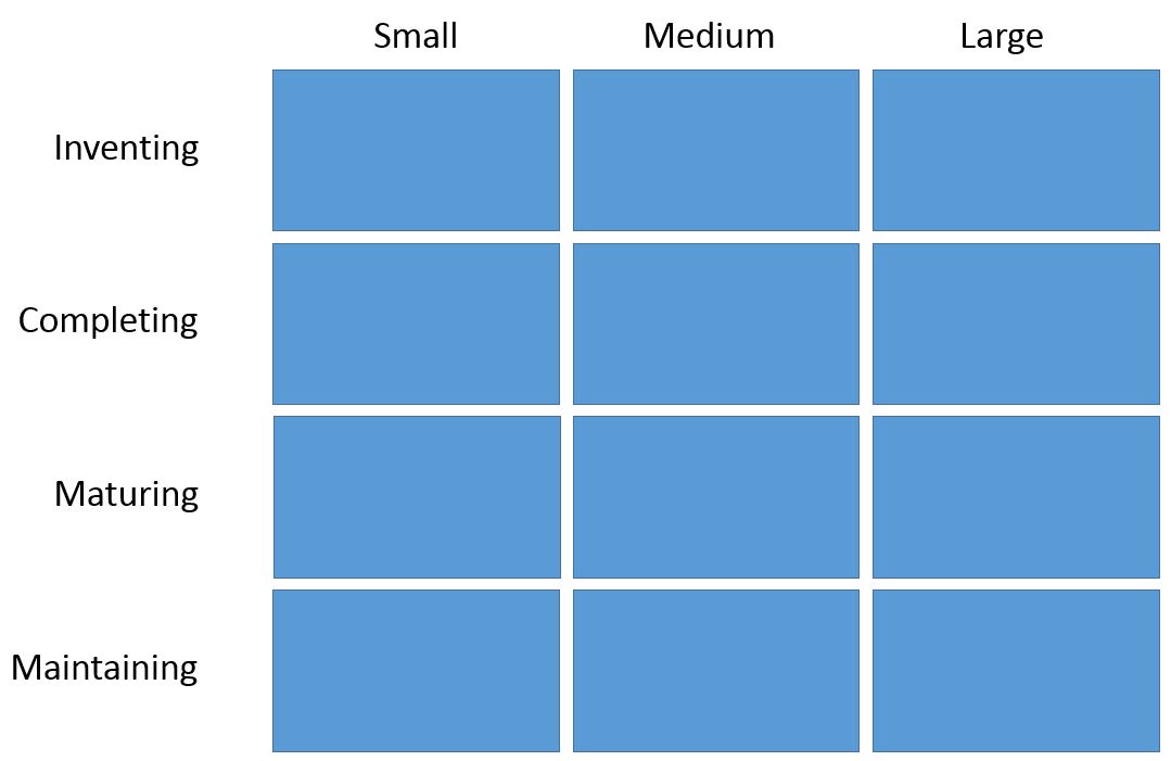 Large Completions, while risky these are likely your best competitive moat, expect to invest heavily here but also be prepared for this bucked to be a complete failure.  It will happen a lot, so make sure the failure does not sink the boat.  You do this by not letting a single team take a dependency on anything in the large bucket until it ships.  Do not break this rule under ANY circumstances or things will go poorly.