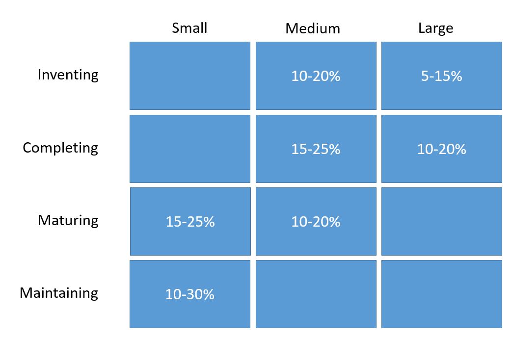 Investment in projects are ranked as Small, Medium, or Large by relating the current project size to the project leaders largest successful project.  In other words, a large investment is defined as a project that approaches or exceeds the project leaders largest successful project size.  Large is anything 90% of their largest effort ever and up.  Small is anything 15% of their largest effort and down.  And Medium is between 15 and 90…  Most people say the Medium window is too large.  Well, I determined these breakpoints based on observed project failure rates.  When a person manages a project close to and exceeding their largest project ever their tools and processes are not setup to scale to that high a level.  As such their rate of failure significantly increases.  Conversely at the other end of the spectrum, a project does not see significantly reduced risk until the project gets so small the leader can literally run the project in their sleep.  You will also find that when a project is in the range where the leader is comfortable and has tools and techniques that scale appropriately, their delivery rate will be fairly consistent.  Additionally, note that any project involving more than 20-25% of the total development org is always considered large given failure consumes such a large % of the portfolio.